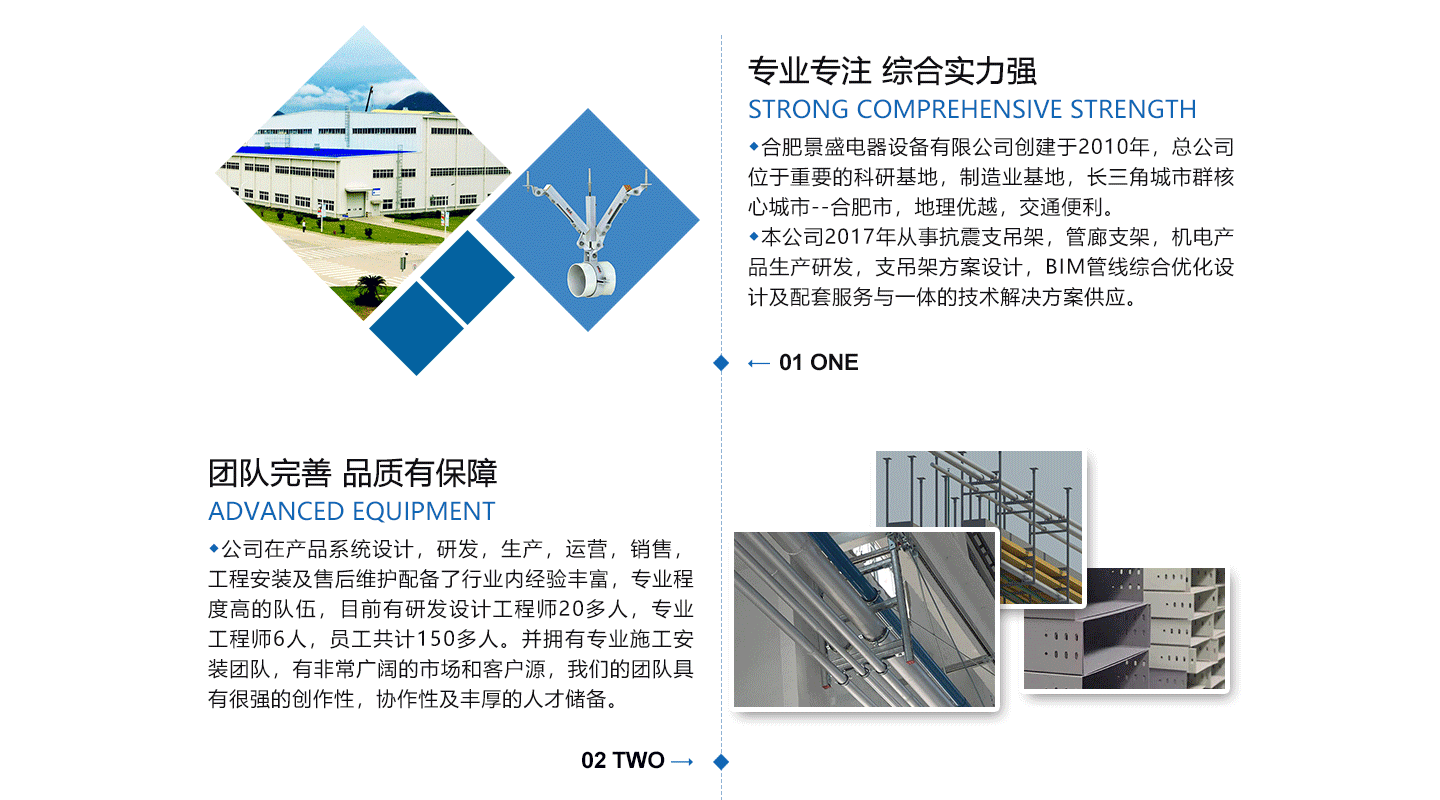 合肥景盛電器設(shè)備有限公司創(chuàng)建于2011年,注冊資本3000萬,總公司位于中國重要的科研基地,制造業(yè)基地,長三角城市群中心城市-----合肥市,地理位置好,交通方便。本公司2017年從事抗震支吊架,電纜橋架,機電產(chǎn)品生產(chǎn)研發(fā),支吊架方案設(shè)計,BIM管線綜合優(yōu)化設(shè)計及配套服務(wù)與一體的技術(shù)解決方案供應(yīng)。公司在產(chǎn)品系統(tǒng)設(shè)計,研發(fā),生產(chǎn),運營,銷售,工程安裝及售后維護配備了行業(yè)內(nèi)經(jīng)驗豐富,服務(wù)程度高的隊伍,目前有研發(fā)設(shè)計工程師20多人,工程師6人,員工共計150多人。并擁有施工安裝團隊,有非常廣闊的市場和客戶源,我們的團隊具有很強的創(chuàng)作性,協(xié)作性及豐厚的人才儲備。 公司先后通過ISO9001:2015質(zhì)量管理體系認證...